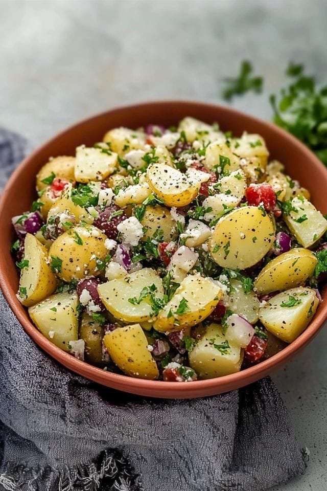 Tender potatoes tossed with peppery arugula, red onion, capers, and sun-dried tomatoes, all brought together with a zesty lemon-olive oil dressing. No mayo — just fresh, clean, and vibrant Mediterranean ingredients.
