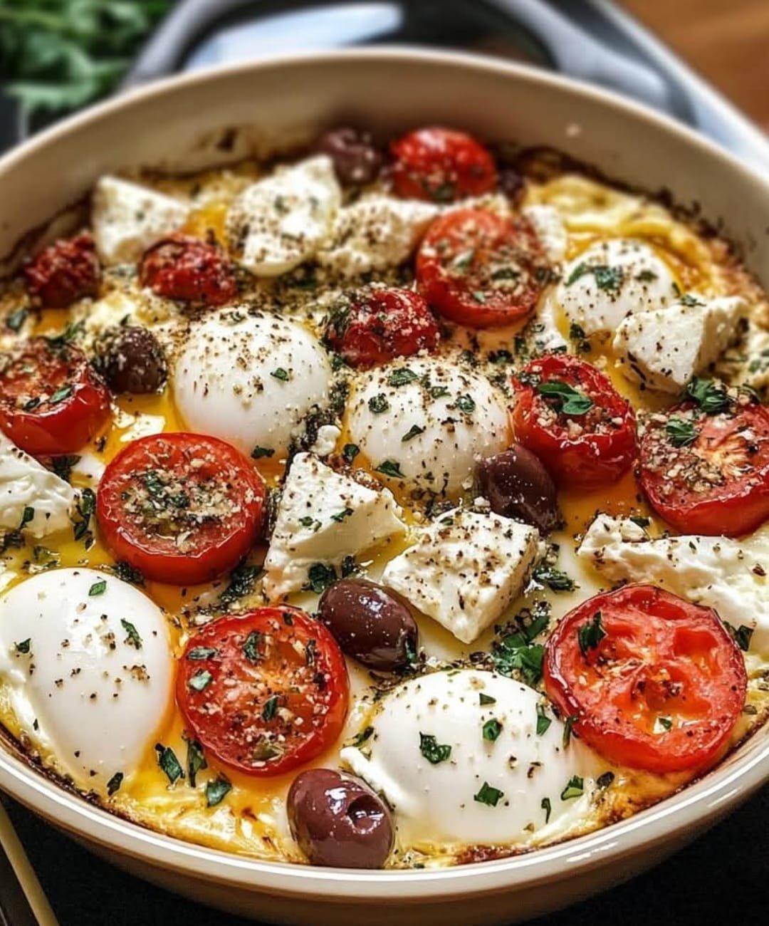 Remove from the oven, scatter the Kalamata olives on top, and garnish with fresh parsley or basil.