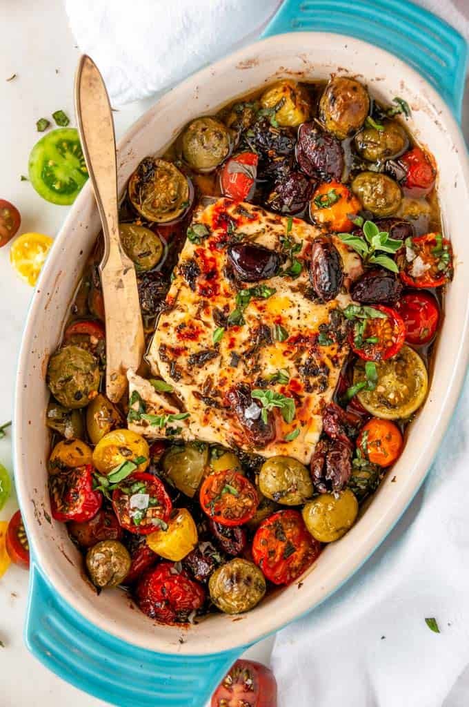 Bake uncovered for 30 minutes, until tomatoes burst and feta is soft and lightly golden.