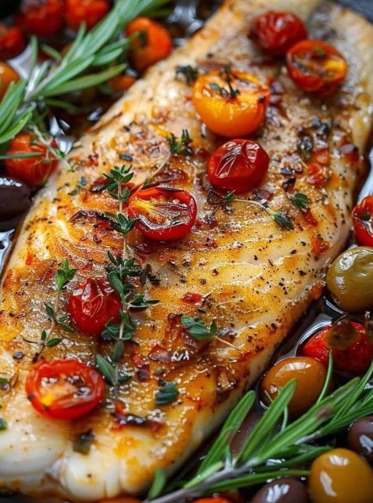 Tender white fish fillets baked with juicy tomatoes, briny olives, capers, lemon, garlic, and fragrant herbs. It’s a one-pan Mediterranean masterpiece — fresh, zesty, and heart-healthy. Perfect served with couscous, rice, or crusty bread.