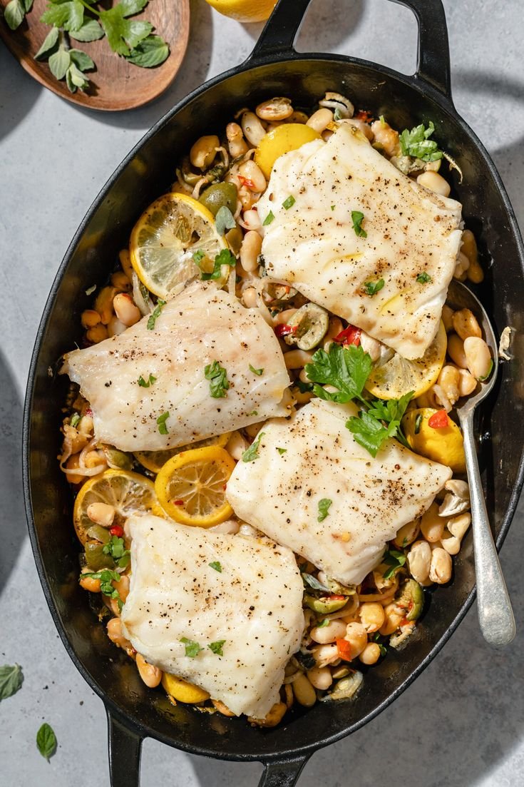 This Mediterranean Baked Fish is a light yet comforting one-pan seafood dish where flaky white fish is baked over a bed of lemony spinach, tender white beans, and herbs. It’s clean, nourishing, and very Mediterranean — perfect for a healthy dinner that feels special without being heavy.No spice, no frying — just pure coastal Mediterranean flavor.