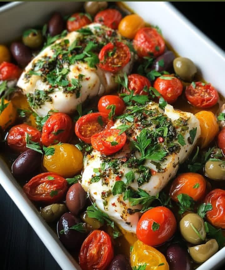 This dish is a light, healthy, and vibrant Mediterranean classic featuring tender white fish baked with juicy cherry tomatoes, briny olives, garlic, and fragrant herbs. It’s simple yet elegant—perfect for a quick weeknight dinner or a special meal. The combination of olive oil, lemon, and herbs creates a bright, zesty flavor that complements the delicate fish beautifully.