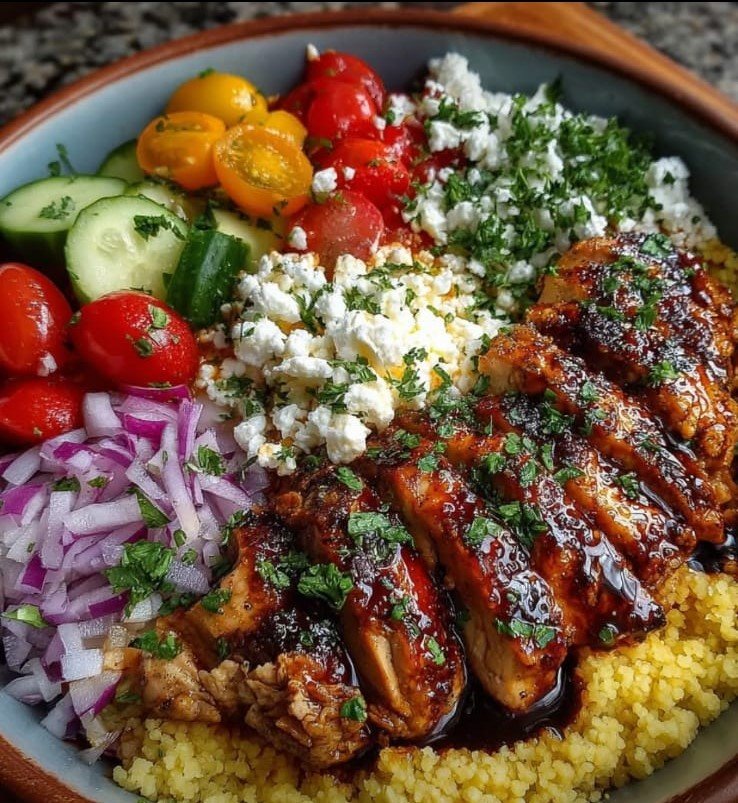 This Mediterranean bowl is fresh, flavorful, and satisfying. Juicy balsamic-marinated chicken rests atop light, fluffy couscous, paired with crisp cucumbers, sweet tomatoes, tangy feta, and a sprinkle of fresh parsley. Kalamata olives and red onions add depth, while a drizzle of tzatziki or a simple lemon-olive oil dressing brightens the dish. It’s perfect for lunch or dinner, easy to prepare ahead of time, and packs well for meal prep. The combination of protein, grains, and vegetables delivers balanced nutrition and vibrant Mediterranean flavors in every bite.