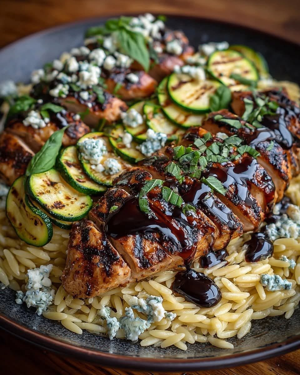 Divide orzo between plates, top with grilled zucchini and balsamic-glazed chicken. Sprinkle crumbled feta and garnish with fresh basil or parsley.