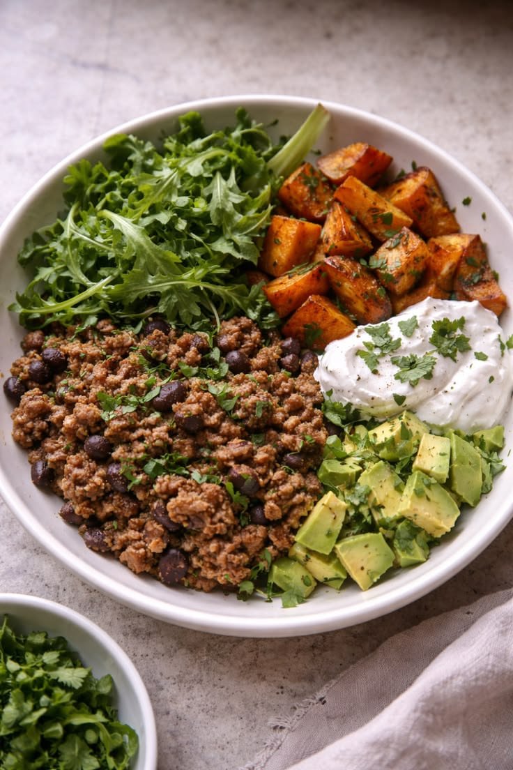 The Mediterranean Beef and Black Bean Bowl with Sweet Potato, Avocado, and Kale Salad is a hearty and nutritious meal packed with protein, fiber, and healthy fats. This bowl combines seasoned ground beef, black beans, roasted sweet potatoes, creamy avocado, and a fresh kale salad to create a balanced dish full of Mediterranean-inspired flavors.The roasted sweet potatoes add natural sweetness, while the black beans and beef provide satisfying protein. Fresh kale, avocado, and a simple lemon-olive oil dressing bring brightness and freshness to the bowl.