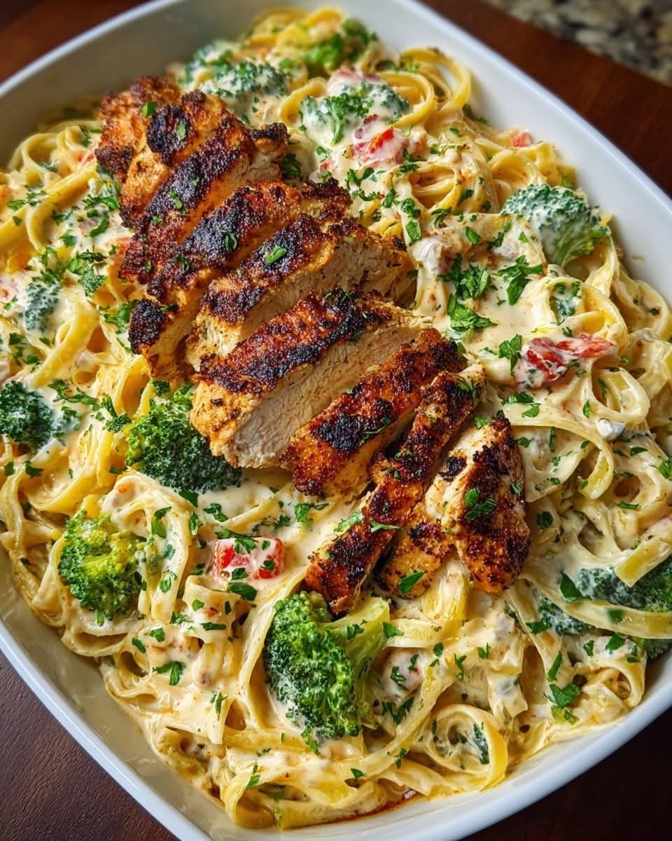 Mediterranean Blackened Chicken Alfredo Pasta with Broccoli and Cherry Tomatoes
