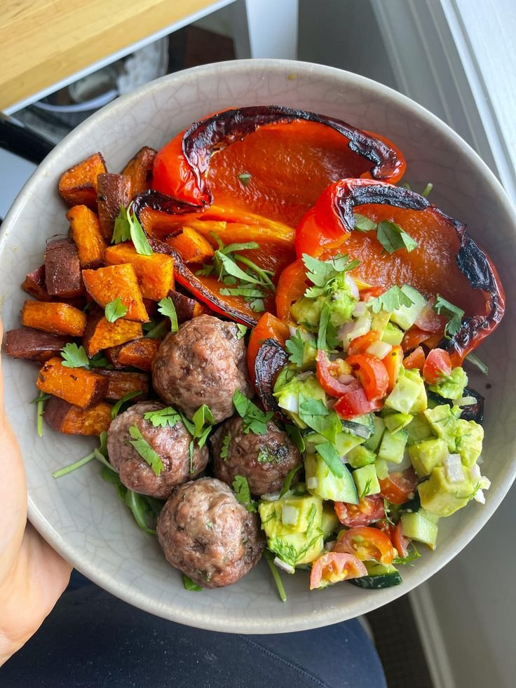 Mediterranean Bowl with Lamb Meatballs & Avocado Salad