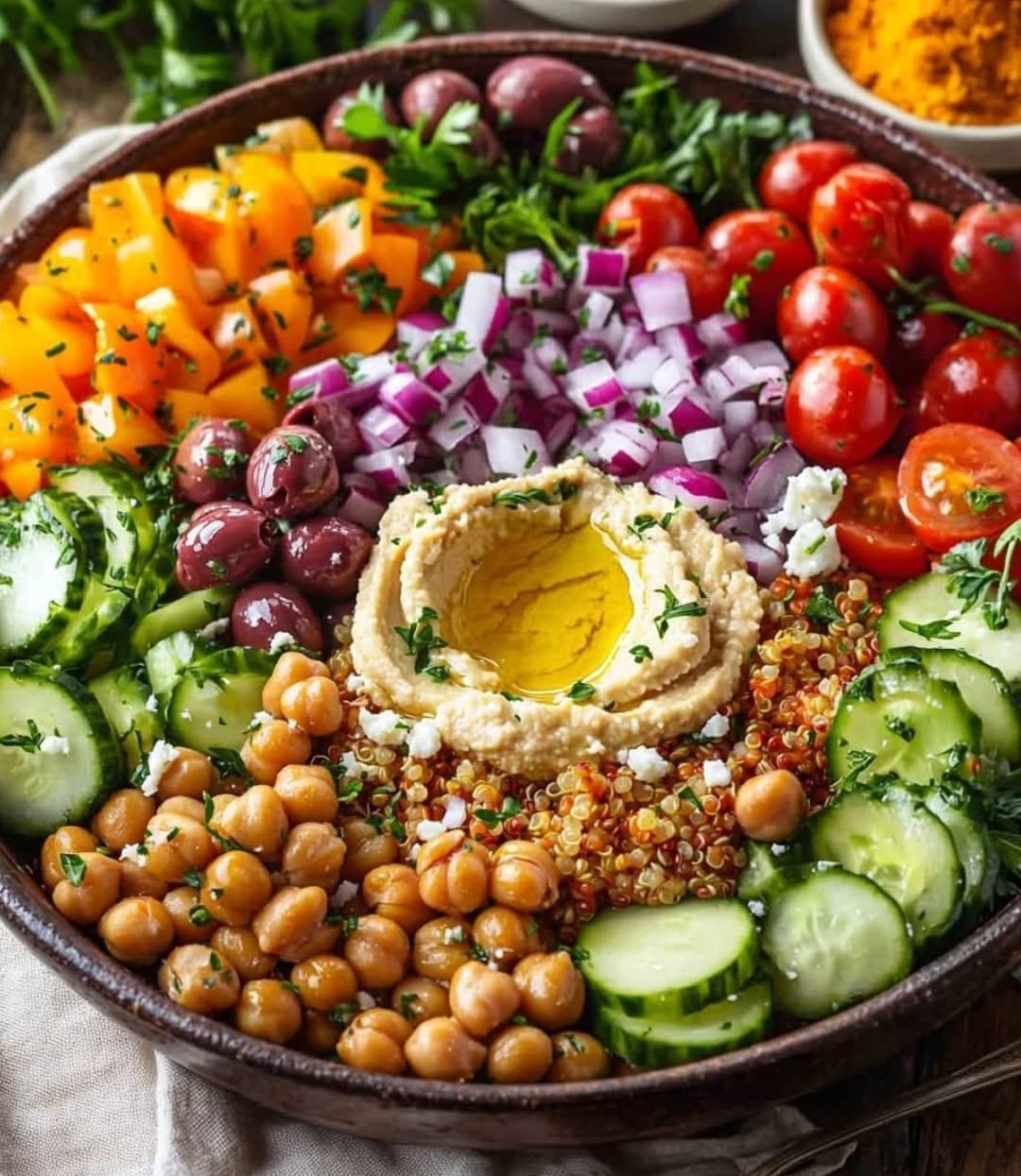 This Mediterranean Buddha Bowl is a nourishing, colorful, and well-balanced meal that combines fresh vegetables, grains, protein, and a delicious homemade dressing. Packed with fiber, healthy fats, and plant-based protein, this bowl is perfect for a light yet satisfying lunch or dinner. The combination of roasted chickpeas, creamy hummus, tangy feta, and fresh herbs brings a burst of Mediterranean flavors in every bite.