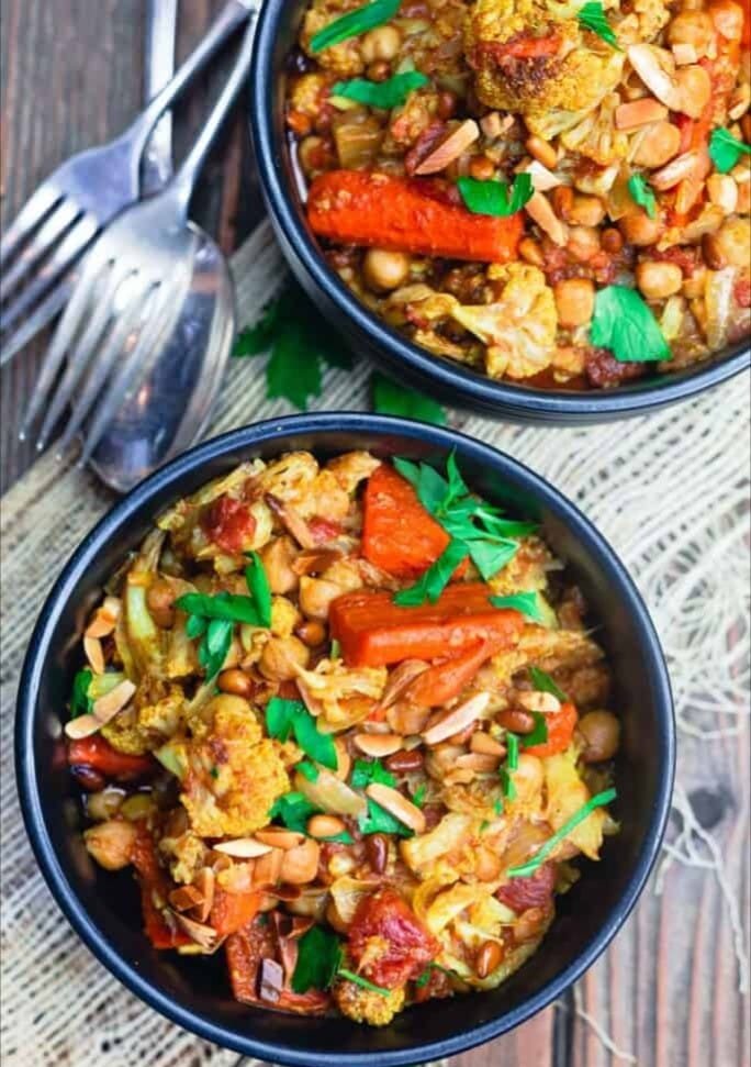 My family’s favorite chickpea stew is a hearty vegan stew, loaded with roasted cauliflowers, carrots, and tomatoes. The warm Mediterranean spice mixture deeply flavors this comforting vegan chickpea stew with notes of cumin, cinnamon and turmeric!
