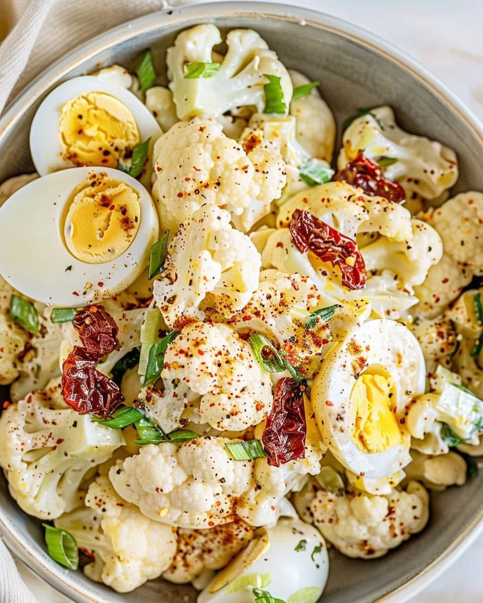 A vibrant and flavorful salad combining roasted cauliflower with protein-packed hard-boiled eggs and a zesty, slightly spicy dressing. Sun-dried tomatoes add a sweet, tangy punch, while green onions bring fresh crunch. This Mediterranean-inspired salad is quick to make and perfect as a light meal or side dish.