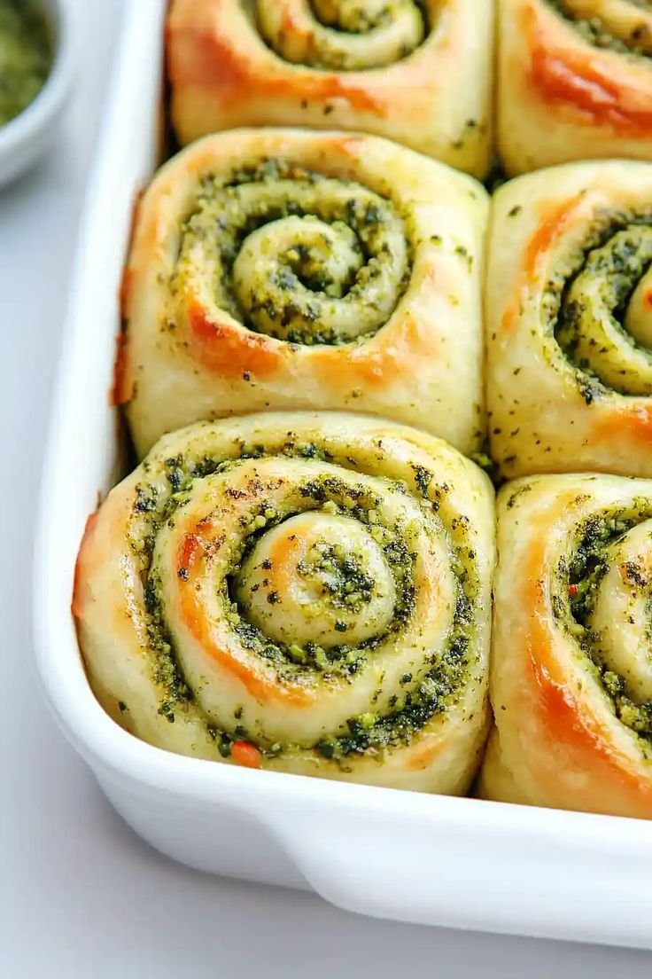 Soft, golden rolls filled with creamy spinach, basil pesto, garlic, and melty cheese. They taste like a Mediterranean-style savory cinnamon roll — cheesy, herby, and festive. Perfect as an appetizer, breakfast, snack, or party side.