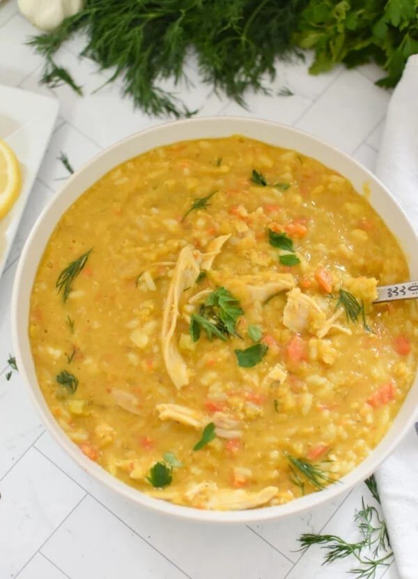 This Mediterranean Chicken Lentil Soup Recipe is a hearty, filling recipe that is perfect for those chilly days. Shredded chicken is mixed with red lentils, vegetables, warm spices and topped with fresh herbs. You will love this easy soup that also freezes well!