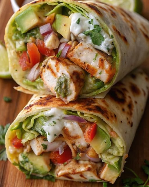 Mediterranean Chicken Avocado Ranch Burritos with Creamy Avocado Sauce
