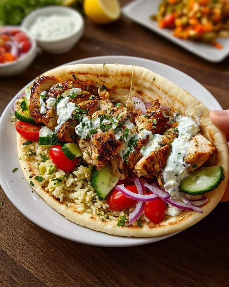 These Mediterranean chicken gyros feature juicy, lemon-garlic marinated chicken, warm pita, fresh vegetables, and a rich yet refreshing feta-tzatziki sauce. It’s a balanced, protein-packed meal with authentic Greek flavors—comforting, fresh, and irresistibly satisfying.