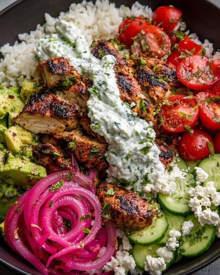 A vibrant Mediterranean-inspired bowl with juicy herbed chicken, fluffy rice, creamy tzatziki, crumbly feta, and fresh veggies. It’s satisfying, non-spicy, and easy to make — ideal for meal prep or a wholesome family dinner.