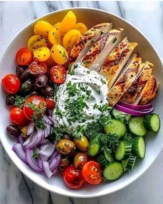 This Mediterranean Chicken Salad Bowl is a fresh, colorful, high-protein meal featuring juicy lemon-herb chicken, crisp vegetables, fluffy couscous (or quinoa), creamy hummus, and tangy feta. It’s perfect for weekday lunches, meal prep, or a light, satisfying dinner. Inspired by classic Mediterranean flavors, this bowl balances bright acidity, savory herbs, and crunchy textures.