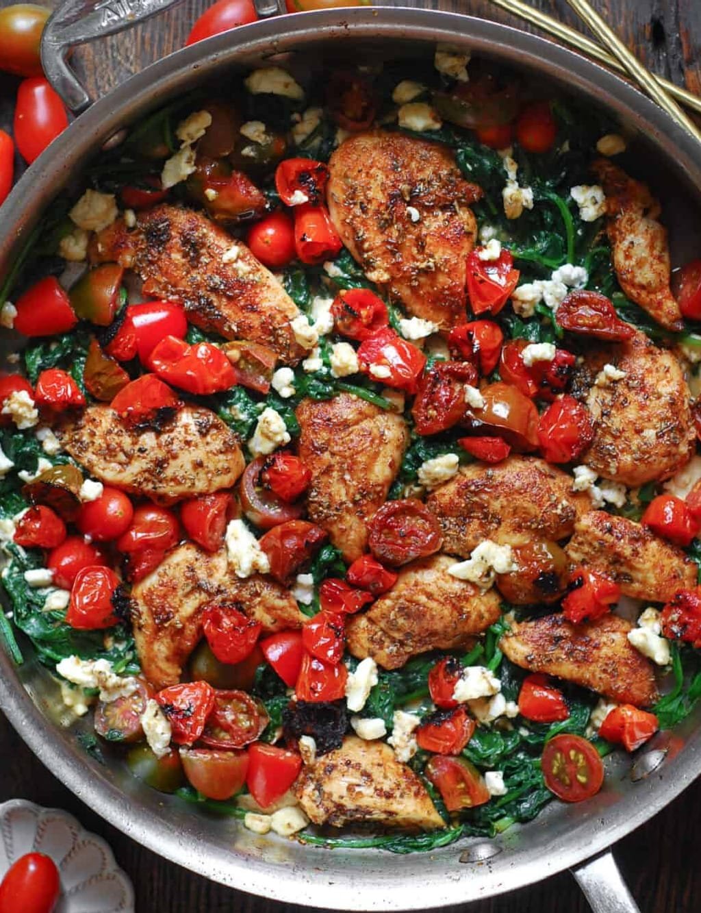 This easy one-pan Mediterranean chicken stir fry comes together in just 30 minutes. It’s a simple yet flavorful weeknight meal featuring Mediterranean cuisine staples: tomatoes, spinach, lemon, oregano, smoked paprika, and feta cheese. It’s healthy, gluten-free, keto, low-carb, and rich in protein and fiber. Serve it as is or with roasted spaghetti squash, rice, orzo pasta, or cauliflower rice.