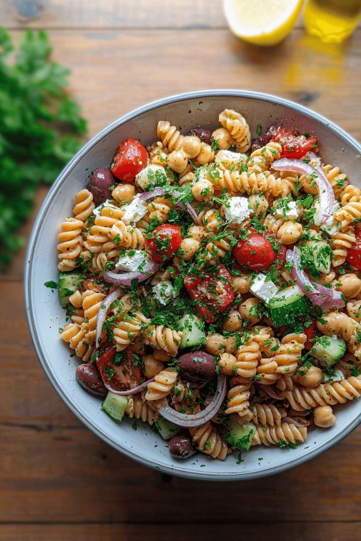 This wholesome pasta salad combines classic Mediterranean ingredients — chickpeas, cherry tomatoes, cucumbers, red onions, and herbs — with tender pasta and a light, tangy olive oil dressing. It’s vibrant, healthy, and can be served cold or at room temperature, making it a great make-ahead dish for any occasion.