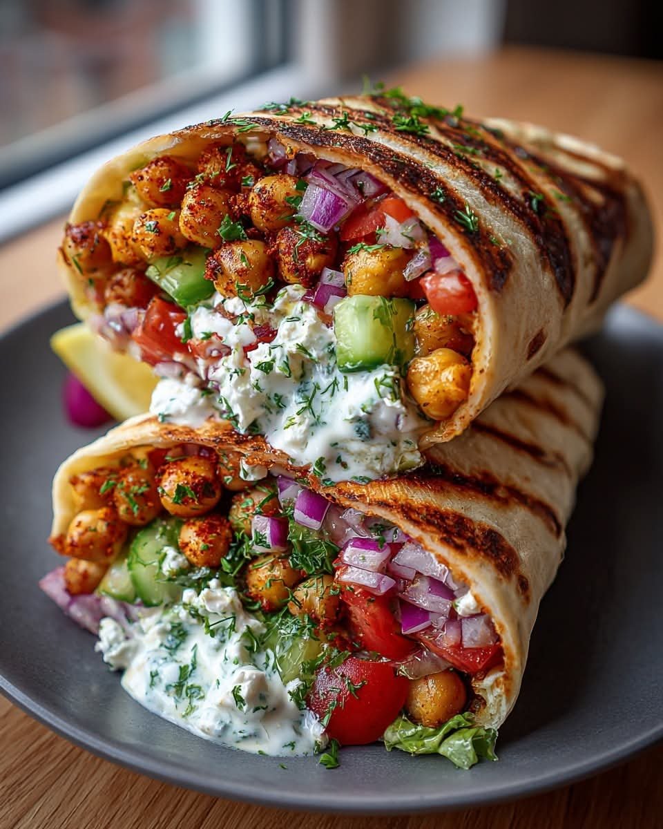 Mediterranean Chickpea & Feta Wrap with Veggies & Yogurt Sauce