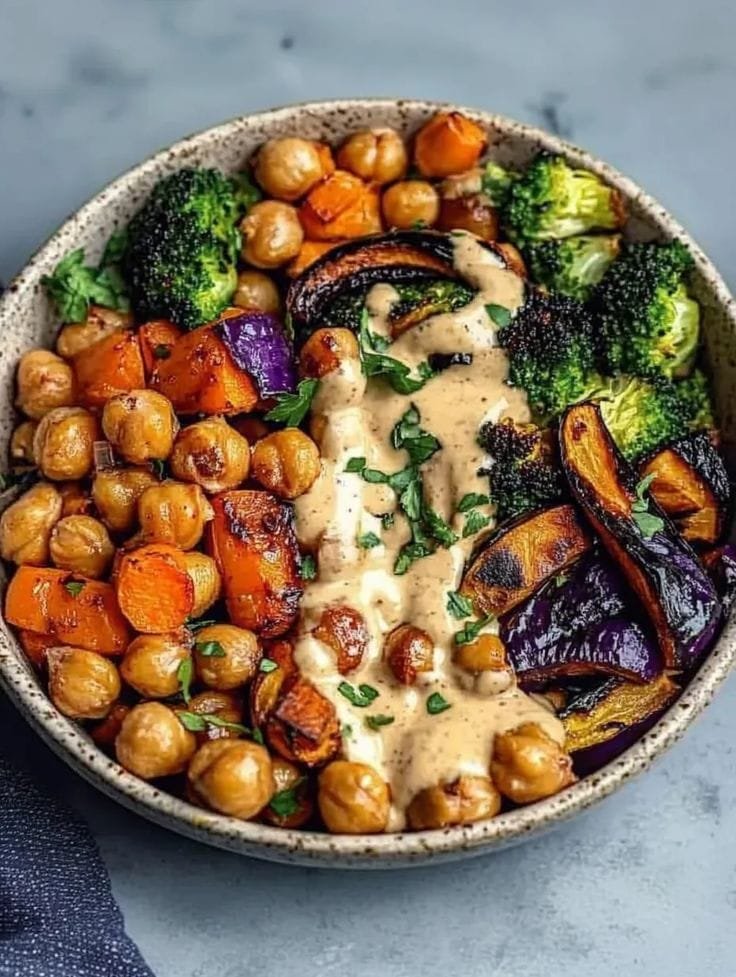 Mediterranean Chickpea & Grilled Vegetable Bowl with Lemon-Tahini Dressing