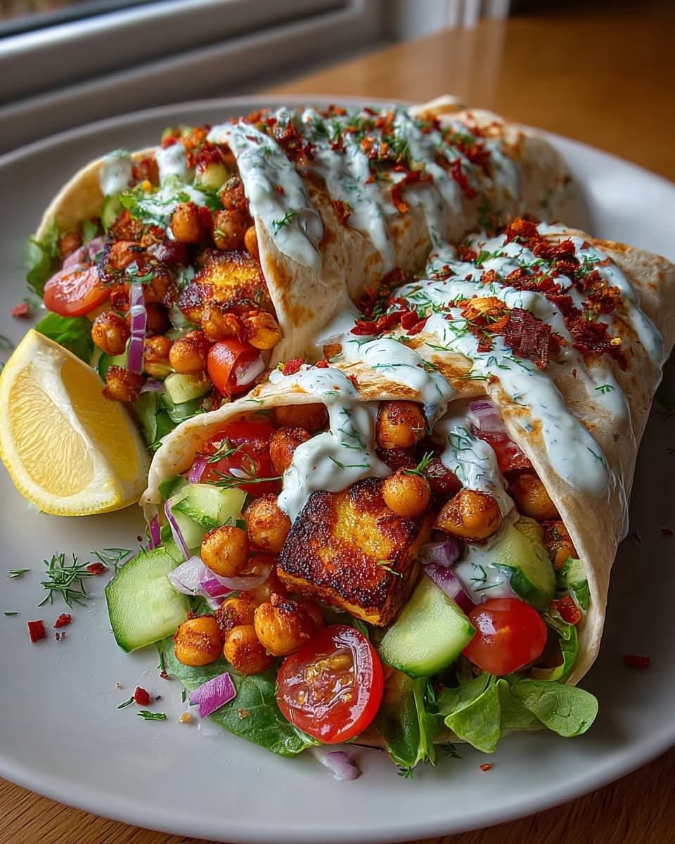 This wrap is simple, colorful and full of Mediterranean flavor. The warm halloumi and chickpeas pair well with the fresh vegetables and cool yogurt sauce, making it a great option for quick meals. It’s flexible enough for meal prep and easy to customize with your favorite extras. If you want, I can make a short caption, a video script or an image prompt for this recipe.