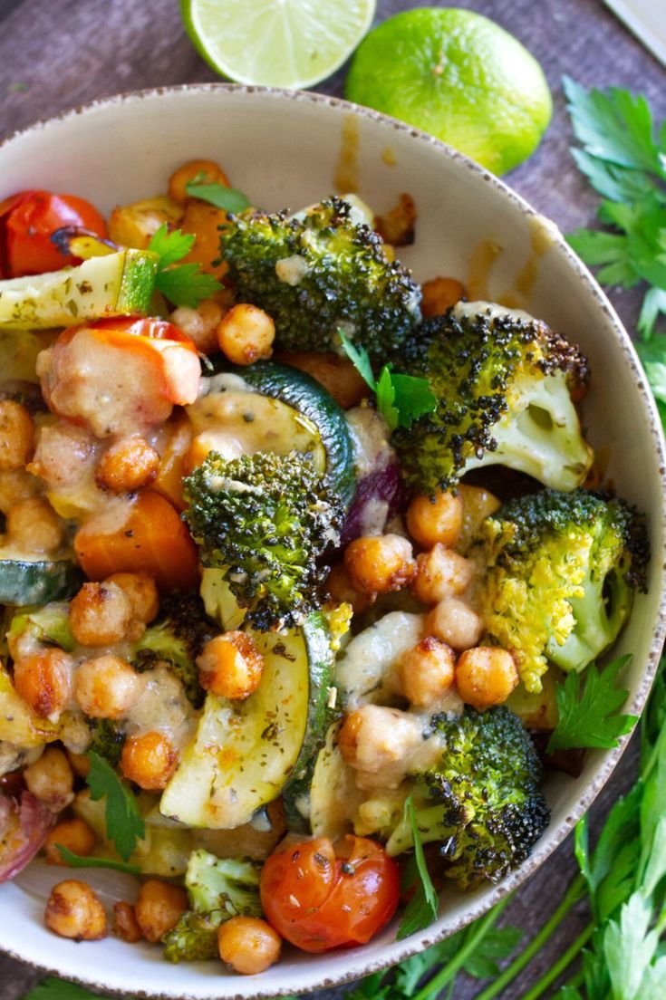 This colorful Mediterranean bowl features roasted chickpeas and vegetables, tossed with olive oil, lemon, and gentle herbs, then finished with a creamy tahini-yogurt sauce. It’s wholesome, filling, and great for lunch or dinner.