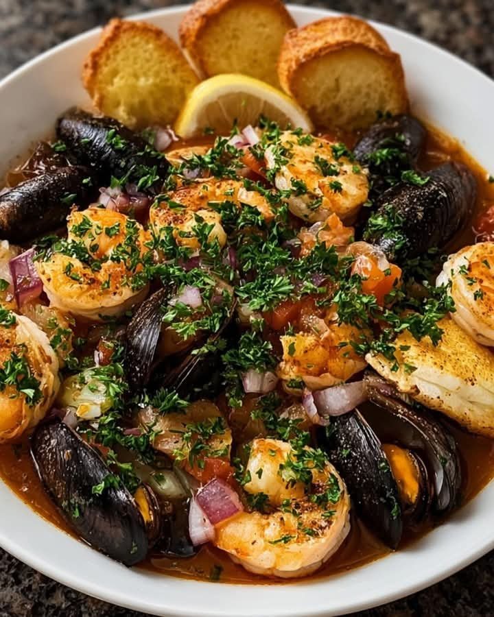 Bouillabaisse is a traditional Provençal seafood stew originating from the port city of Marseille, France. This iconic Mediterranean dish combines a variety of fresh fish and shellfish simmered in a fragrant broth made from tomatoes, fennel, saffron, garlic, and herbs. What sets Bouillabaisse apart is its layered flavor — earthy, briny, herbal, and luxuriously aromatic.