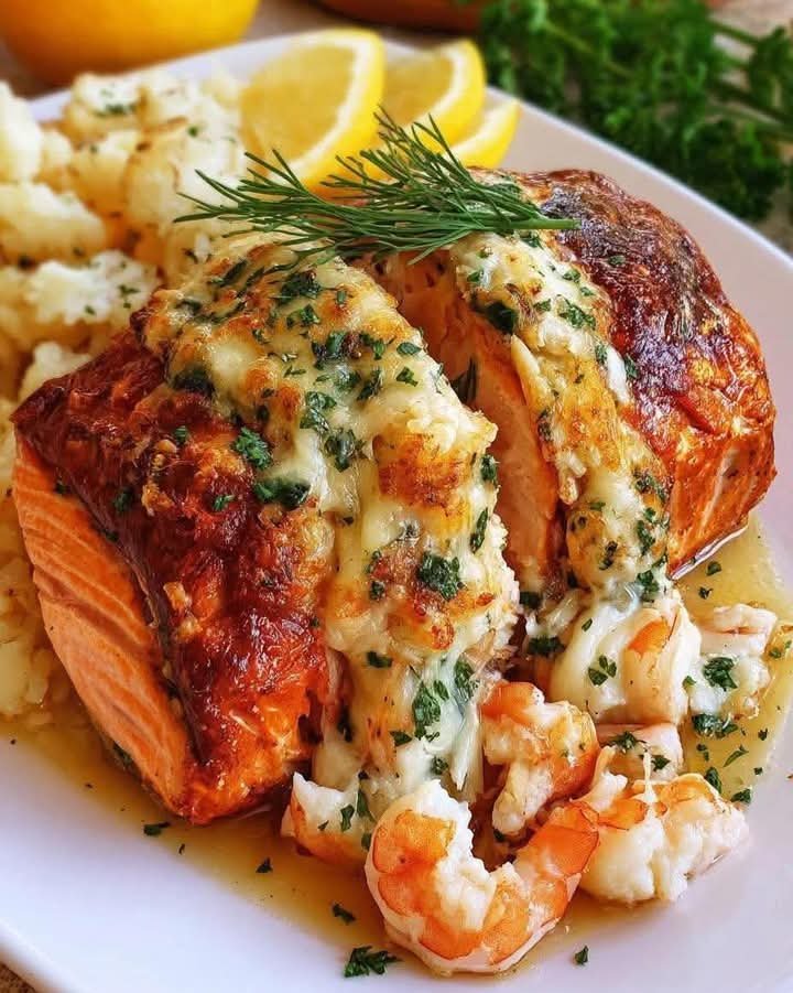 Mediterranean Crab and Shrimp Stuffed Salmon is a luxurious, restaurant-quality dish that combines the rich, buttery flavor of salmon with a zesty, savory seafood stuffing inspired by Mediterranean flavors. Filled with tender shrimp, sweet crab meat, feta, garlic, herbs, sun-dried tomatoes, and lemon, this dish offers a delightful contrast of textures—crispy seared edges, succulent fish, and creamy, herb-laced seafood filling.