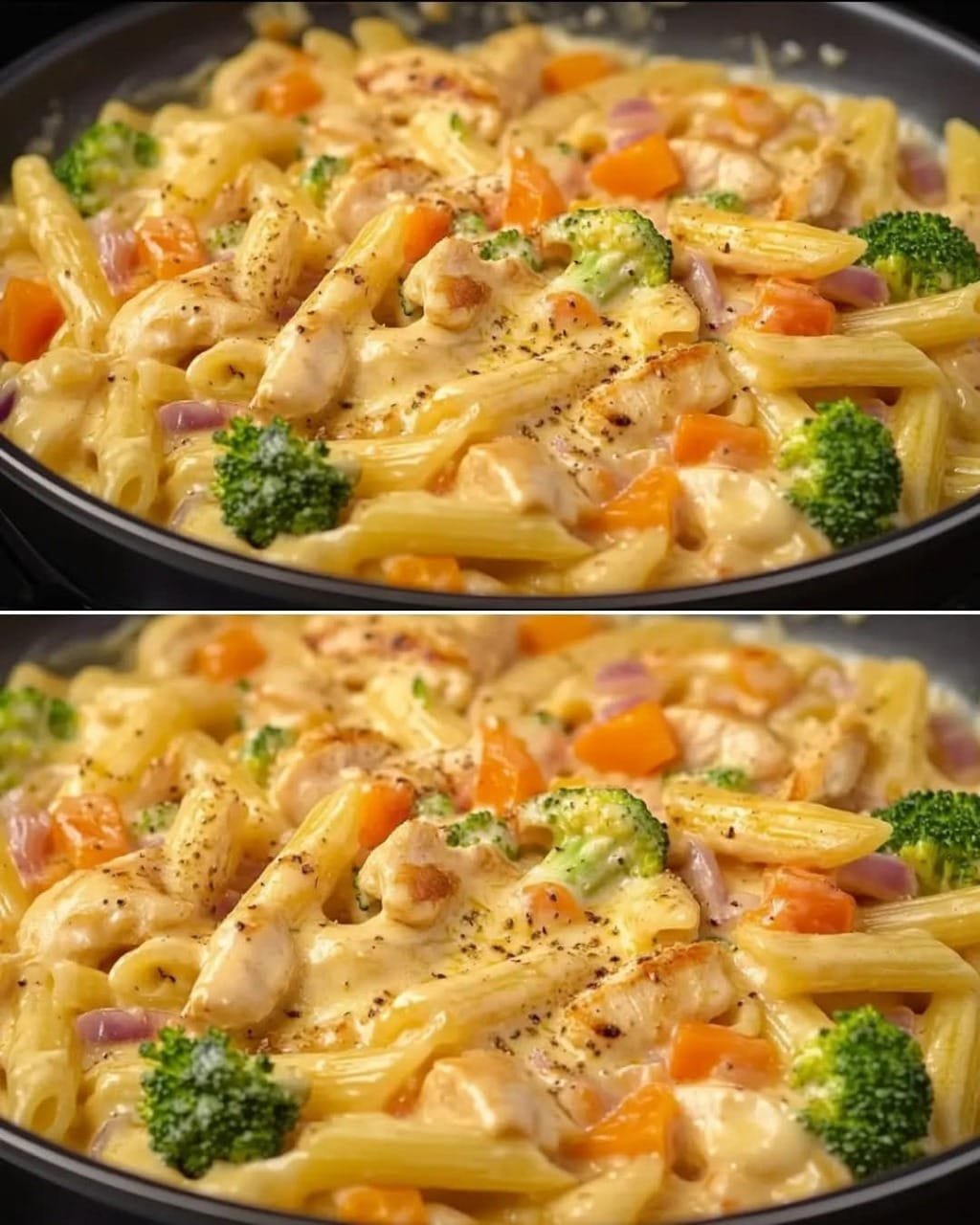This creamy Mediterranean-inspired pasta combines tender chicken, fresh vegetables, and a silky sauce with hints of garlic, Parmesan, and lemon. It’s hearty but balanced, bringing together the richness of cream with the brightness of fresh herbs and optional add-ins like sun-dried tomatoes or olives. Perfect for weeknight dinners, it’s a one-bowl comfort meal that feels both satisfying and fresh.