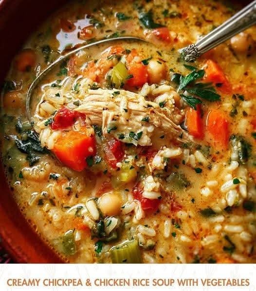 Mediterranean Creamy Chickpea & Chicken Rice Soup with Vegetables
