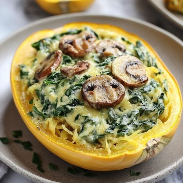 Enjoy this Creamy Spinach and Mushroom Stuffed Spaghetti Squash as a delicious and healthy meal!