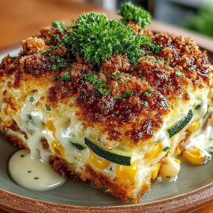 A comforting vegetable casserole made with tender zucchini, sweet corn, garlic, and a creamy Mediterranean-inspired sauce. Topped with Parmesan cheese and baked until golden, this dish works as a side or a light main.