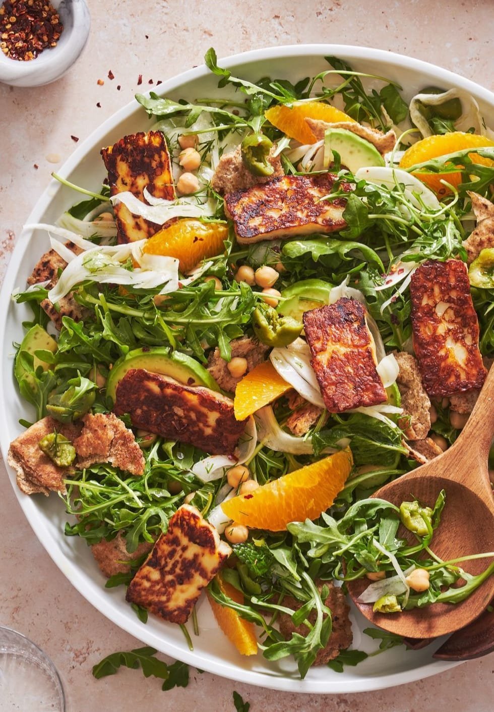 This salad is one of our favorite ways to enjoy halloumi. It has crunchy fennel (or sub celery if you like), juicy orange segments, creamy avocado, crispy fried pita, and a simple herb-packed dressing that ties it all together. It’s is a full-blown MEAL, perfect for those days when you just can’t bring yourself to turn the oven on.