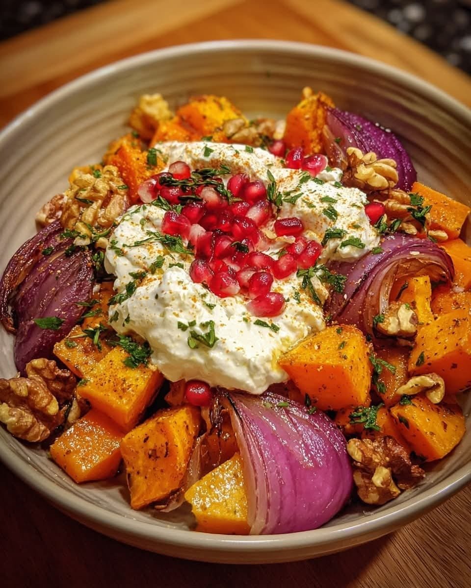 This Mediterranean roasted vegetable salad brings together warm and cool elements in one balanced bowl. The golden vegetables add comfort, the whipped feta makes it creamy, and the walnuts and pomegranate add texture and freshness. It’s simple, colorful, and flexible enough to enjoy with many variations. You can serve it as a complete vegetarian meal or pair it with your favorite protein. If you’d like, I can also format this for a Facebook post, video script, or printable recipe.