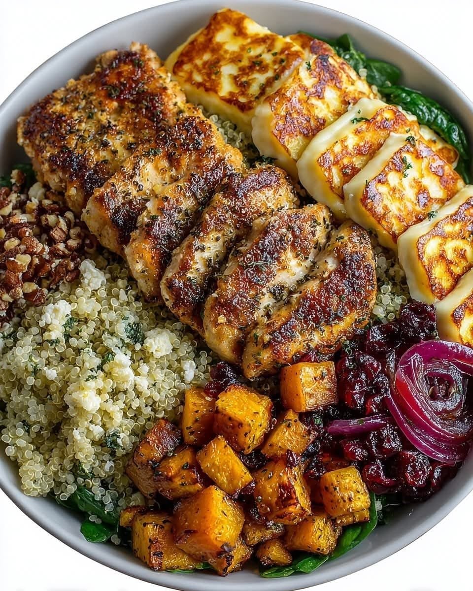 Start with a layer of quinoa or grains at the base of each bowl. Add spinach or kale on top. Arrange sliced chicken, seared halloumi, roasted squash, red onion, cranberries or pomegranate, and nuts. Sprinkle feta over everything.