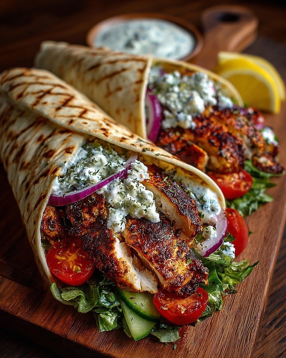 Mediterranean Greek Chicken Wraps with Lemon Yogurt Sauce