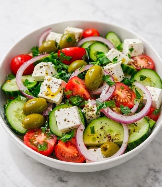 This classic Greek Salad (Horiatiki) is a celebration of Mediterranean simplicity. Juicy tomatoes, crisp cucumbers, and sharp red onion are tossed with briny olives and crowned with creamy, salty feta. Finished with fragrant oregano and a lemony olive oil dressing, it’s light yet satisfying—perfect as a side dish, a mezze platter star, or a refreshing main on warm days.