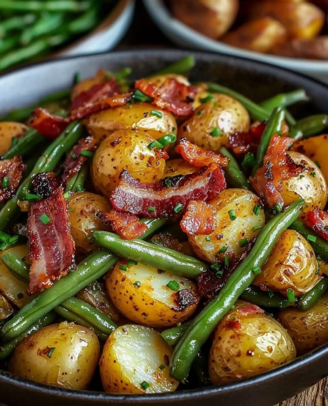 1. Add roasted potatoes and crispy bacon back into the skillet with green beans.