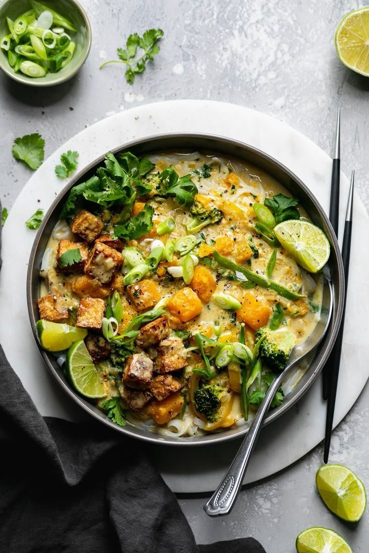 A bold, fresh twist on your classic curry noodle bowl: roasted butternut squash meets tender zucchini ribbons, crispy chickpeas, and green curry-infused coconut sauce. Topped with a creamy tahini drizzle and fresh herbs, it’s a restaurant-level fusion bowl—vibrant, creamy, lightly spicy, and packed with textures.