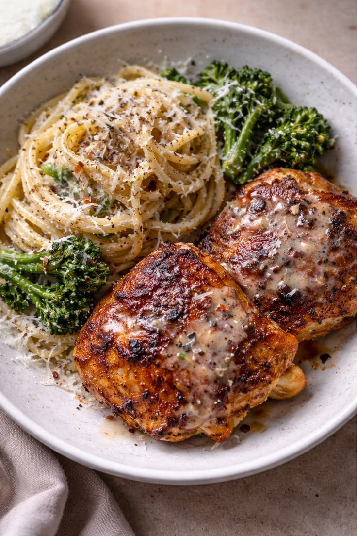 This Mediterranean Grilled Chicken with Broccoli & Garlicky Spaghetti is a simple, flavorful, and balanced meal. Juicy Chicken is grilled with herbs, paired with tender Broccoli, and tossed with aromatic garlic-infused Spaghetti.