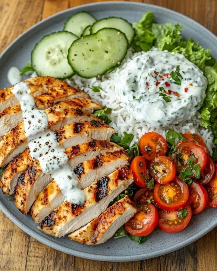 This plate brings together juicy grilled chicken marinated in lemon, garlic, and herbs, paired with a cooling garlic-herb yogurt sauce and a refreshing tomato salad. It’s light yet satisfying, Mediterranean-style eating at its best. Serve with pita bread, couscous, or rice for a complete meal.