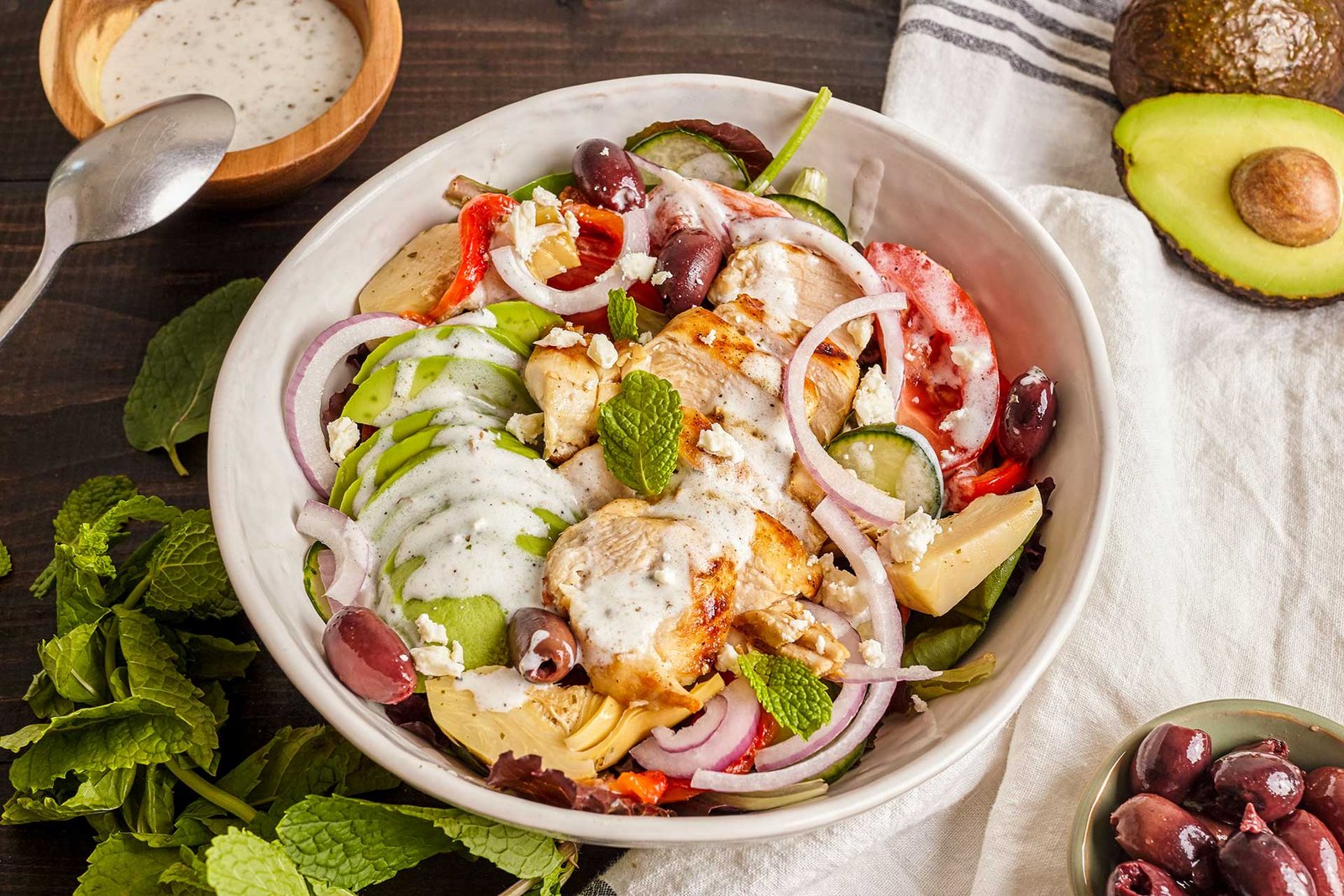 Mediterranean Grilled Chicken Salad with Creamy Yogurt Dressing