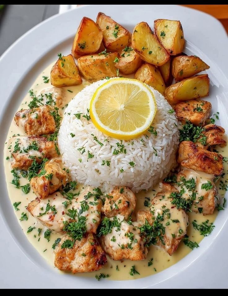 A delicious Mediterranean-style meal featuring juicy grilled chicken, creamy cheesy sauce, and fluffy garlic-herb rice. Mild, aromatic, comforting — perfect for lunch or dinner.