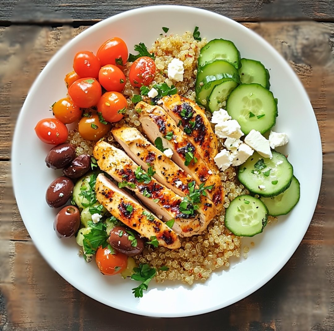 A fresh, protein-packed Mediterranean dish featuring juicy grilled chicken paired with herbed quinoa salad and sweet cherry tomatoes.Flavored with olive oil, lemon, garlic, and fresh herbs, this meal is light, anti-inflammatory, nutrient-rich, and perfect for lunch or dinner.It’s high in protein, fiber, and healthy fats, embodying the Mediterranean diet principles.