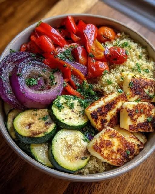 This colorful Mediterranean bowl is a wholesome blend of hearty quinoa, grilled vegetables, and golden, pan-seared halloumi cheese. Bursting with vibrant flavors, it’s a protein-packed, vegetarian meal that’s perfect for lunch or dinner. Healthy, balanced, and satisfying!