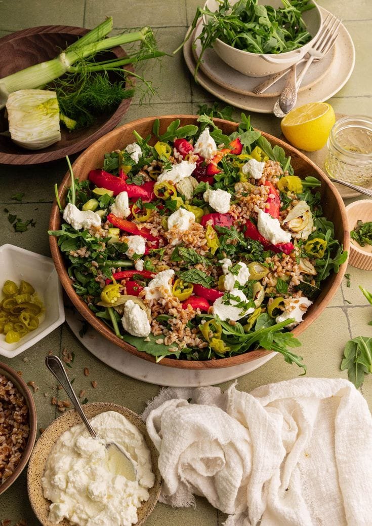 This colorful salad features chewy farro tossed with juicy tomatoes, crisp cucumbers, sweet bell peppers, briny olives, and creamy feta — all coated in a fresh lemon-oregano vinaigrette. It’s a protein-rich, fiber-packed dish that celebrates Mediterranean flavors and seasonal produce.