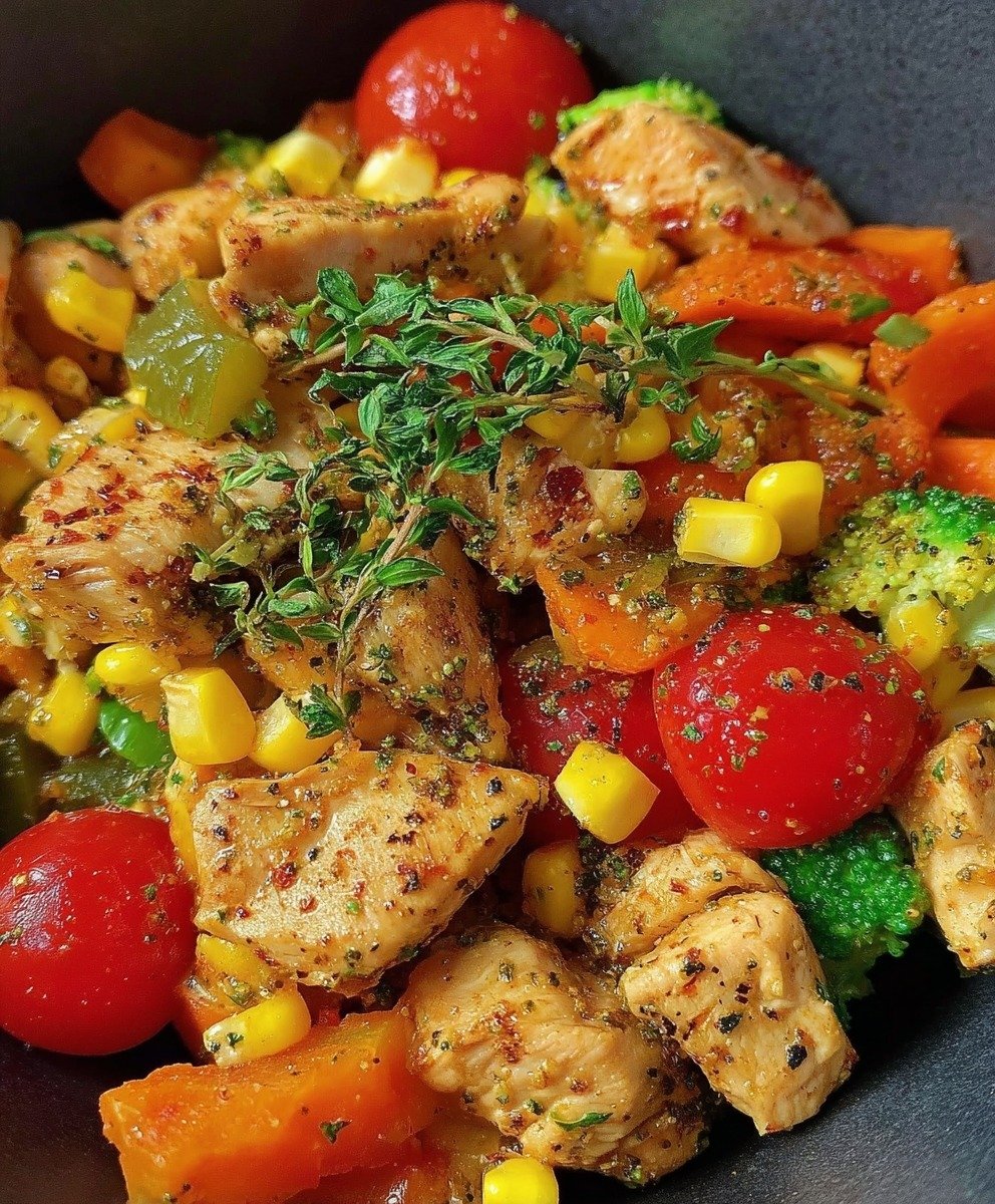 This Mediterranean-inspired stir-fry is a vibrant, colorful, and nutritious one-pan meal. Juicy, bite-sized chicken pieces are sautéed with crisp vegetables, sweet corn, and juicy cherry tomatoes, then seasoned with aromatic Mediterranean herbs. It’s a quick, wholesome dish perfect for weeknight dinners, meal prep, or a light lunch. The combination of garlic, smoked paprika, and Italian herbs creates a simple but bold flavor, while fresh thyme adds a fragrant finishing touch.