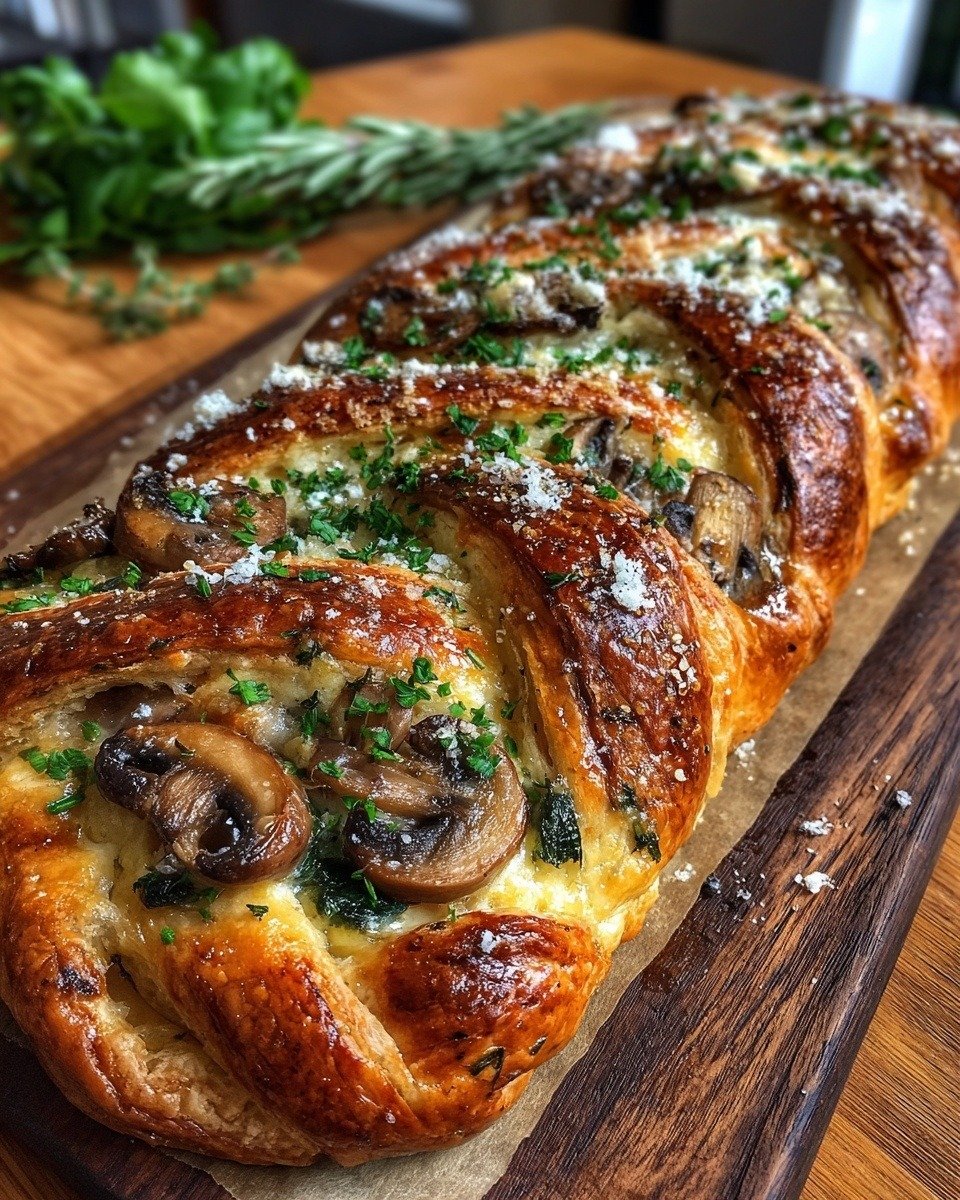 Mediterranean Herbed Mushroom & Gruyère Pastry Plait is a beautiful, savory centerpiece that feels special without being complicated. Flaky pastry is wrapped around a rich filling of sautéed mushrooms, garlic, herbs, and nutty Gruyère cheese, then braided into an elegant plait before baking until golden. The mushrooms bring depth and earthiness, the cheese adds creaminess and structure, and the herbs tie everything together with classic Mediterranean warmth. This dish works equally well as a vegetarian main, a brunch showstopper, or a dinner party appetizer sliced into generous portions. It looks impressive on the table, yet relies on simple ingredients and straightforward steps.