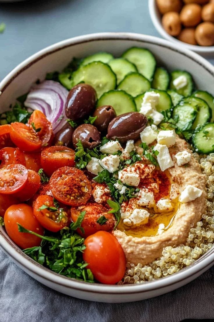This Mediterranean Hummus Bowl is a colorful, nourishing dish that’s all about bold flavors and wholesome ingredients. Creamy hummus forms the rich, savory base, topped with roasted chickpeas, crisp cucumbers, juicy tomatoes, tangy olives, and fresh greens. A drizzle of lemon herb dressing ties it all together, making each bite refreshing, filling, and delicious.
