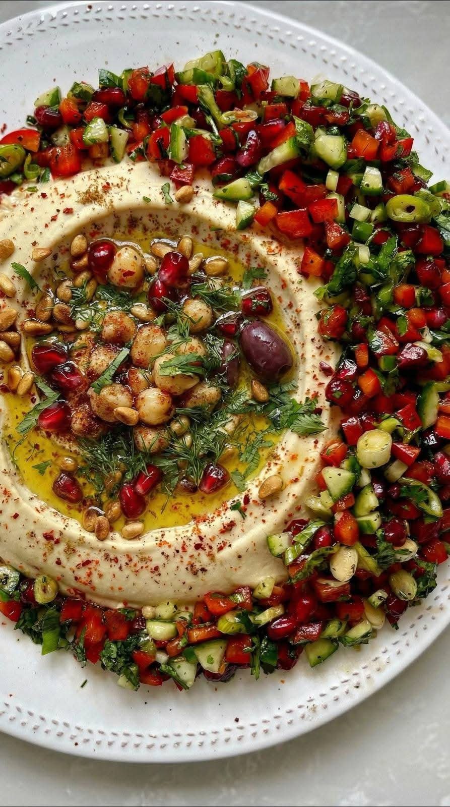 This vibrant platter features smooth, garlicky hummus topped with olive oil and spices, paired with a refreshing finely chopped vegetable salad tossed in lemon dressing. It’s nutritious, naturally vegetarian, and full of fresh flavors and textures.